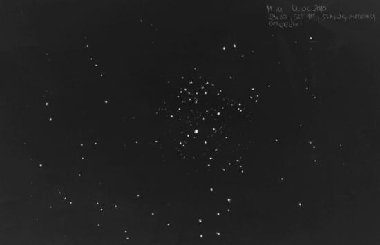 M11 czyli Dzika Kaczka. Typowo letnia gromada: użyłem 2 okularów: Swan 25 (power 112x) i Hyperion 31mm (power 90,3x) by odwzorować pole. Gromada otwarta M11 liczy 2900 gwiazd. Znajduje się w odległości 6000 lat świetlnych od Ziemi.