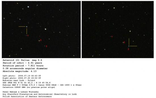 Dodatkowe informacje: Fotka pokazuje niemal dobowy ruch asteroidy 2 Pallas. Zachęcam wszyskich do takich obserwacji. Osobiście dla mnie jest to bardziej interesujące niż kolejna M 31, 27, 39, 57, 33 i inne NGC 7000... ;-)))