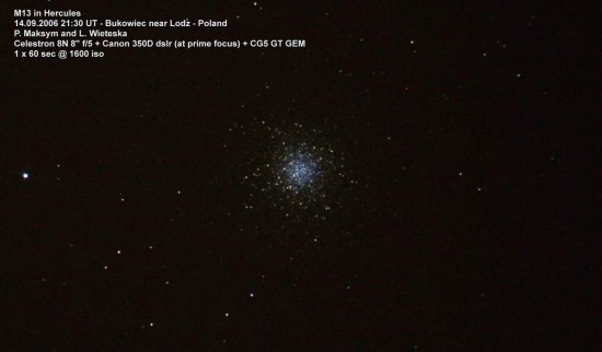 Wiem ale wczoraj były tylko próby. Zasadniczo nastawiamy się na focenie asteroid. Nie znaczy to, że nie zrobimy paru eMek. Woda tej nocy płynęła po wszyskim. Teleskop nie był "zalainowany z aparatem" tylko z okularem, nie trafiał więc idealnie w obiekt, szukaczyk totalnie zalany wodą, że wyracie go pomagało tylko na 20 sekund. Ledwo co złapaliśmy ze słabszych obiektów M57 i na ok. 90 sekundach złaalismy już jaśniutko gwiazdę centralną. To nas cieszy bo oznacza, że daje szanse na drift scanning zakryć asteroidalnych tym telepem i Canonem, z czasem ustawionym ze wzorca, gwiazd nawet pod 16 magnitudo!