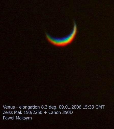 Dodatkowe informacje: Crop z powiększenia. Widać wyraźnie turbulencję powietrza nad miejskimi dachami. Wenus była ekstremalnie nisko nad horyzontem. |