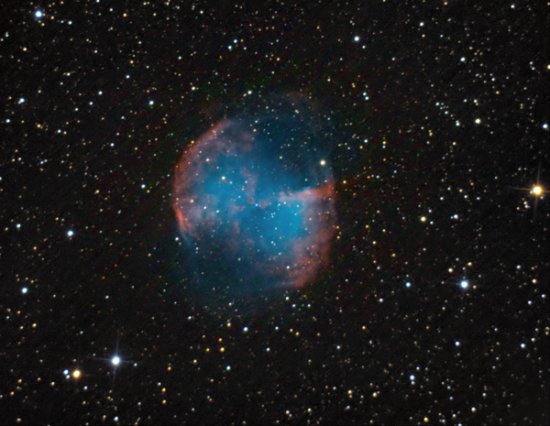 Dziwię się w sumie że używasz teleskopu systemu Dalkirkhama Cassegraina do astrofoto mgławicowego (chodziło zapewne o 2 metrową ogniskową potrzebną do uzyskania odpowiedniej skali zdjecia), w końcu to tylko planetarny spotter ostry tylko w pobliżu osi optycznej bo z komą dużo wiekszą niż klasyczny Cassegfrain z eliptycznym lustrem wtórnym ale mimo to widać tu rękę mistrza i zdjęcie jest jednym z najlepszych w galerii i najlepszym M27 zarazem. | |
