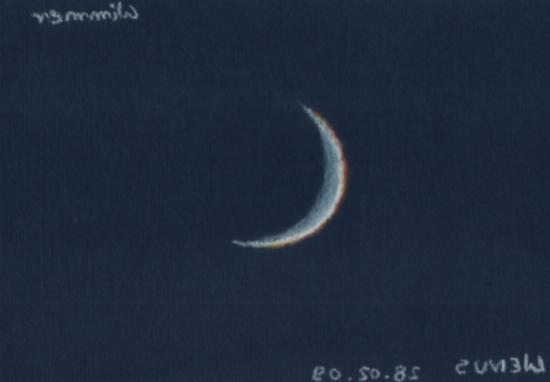 Dodatkowe informacje: Okular: Antares SW 7,4mm. Filtr: Moon & SkyGlow. Kolorowe pastele na granatowym papierze. Widoczna kolorowa otoczka to refrakcja atmosferyczna. Szkic odbity prawo-lewo dla zachowania obrazu ziemskiego. |