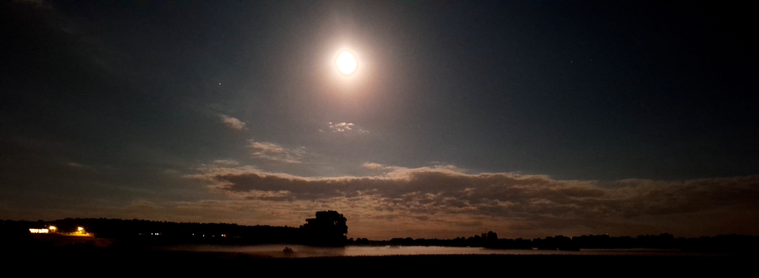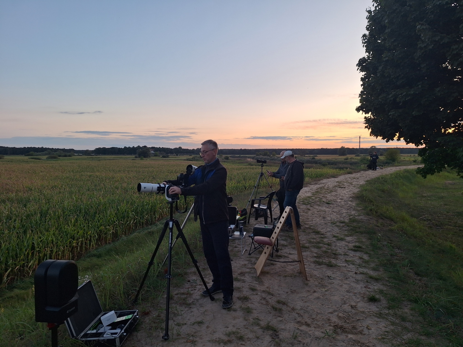 Zaćmienie było wieczorne, ze wschodzącym Księżycem w fazie zaćmienia całkowitego, więc w planach mieliśmy wybór miejscówki z otwartym azymutem 101 stopni i malowniczą rzeźbą widnokregu. No i bez drutów. Niestety, chmury zrewidowały nasze wymagania, bo wieczorem dość gęsto zasnuły wschodni horyzont. Dzień przed zaćmieniem rozważaliśmy górkę w okolicy Thomasa lub pole w mojej okolicy, ale ostatecznie pojechaliśmy do Rogalinka na pole zaraz za mostem. Tam okazało się, że pobliski las jest jednak zbyt pobliski i zabiera nam cenne stopnie nad horyzontem. Wtedy dostałem wiadomość od Tomka, że jest już na grobli, co skłoniło nas do podjechania tam i ocenę sytuacji. Było tam już sporo grupek ze sprzętem, chmury i tak były wyżej niż widnokrąg, więc zadecydowaliśmy, że zostajemy na grobli w dobrym towarzystwie i co będzie to będzie. Czasu na jakieś grubsze przemieszczenie się i tak już nie mieliśmy.