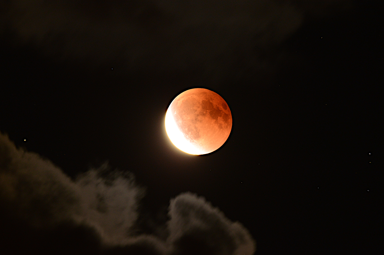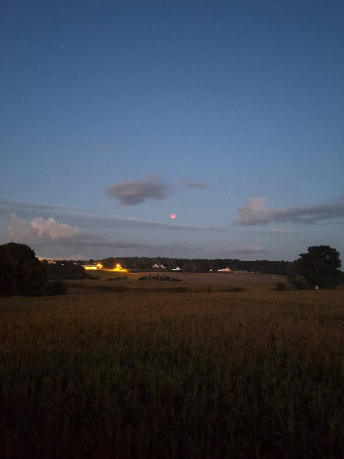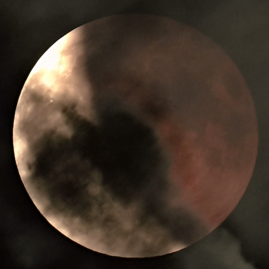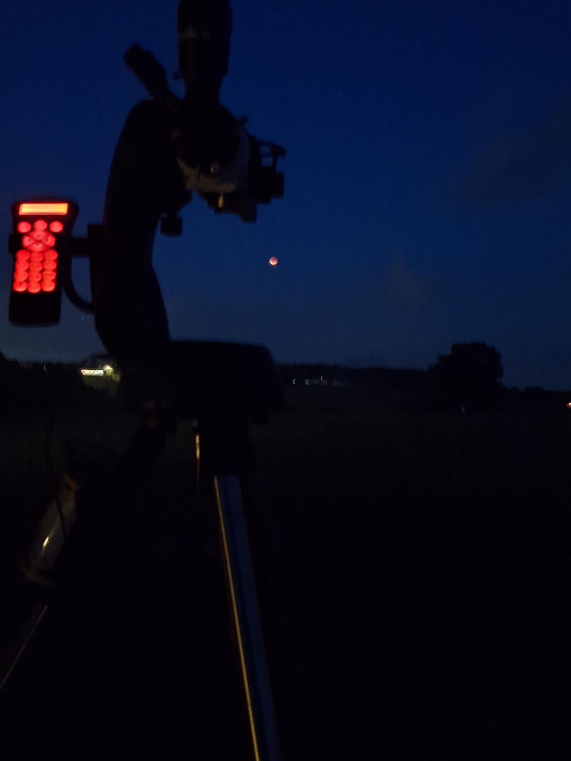 Do fazy maksymalnej mieliśmy zaledwie 15 minut, a Księżyc raz po raz chował się za kolejnymi pasmami chmur. W końcu jednak wspiął się nad nie i nareszcie mieliśmy czysty widok z dłuższą perspektywą czystego nieba. Wraz z zapadaniem zmroku pojawiała się coraz wyraźniejsza Droga Mleczna. Księżyc był ciemnoczerwony z delikatnym przejściem do nieco jaśniejszego odcienia w dolnej części tarczy.