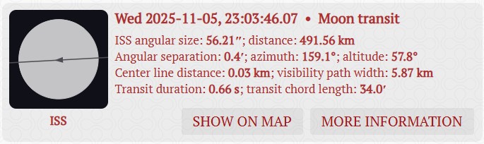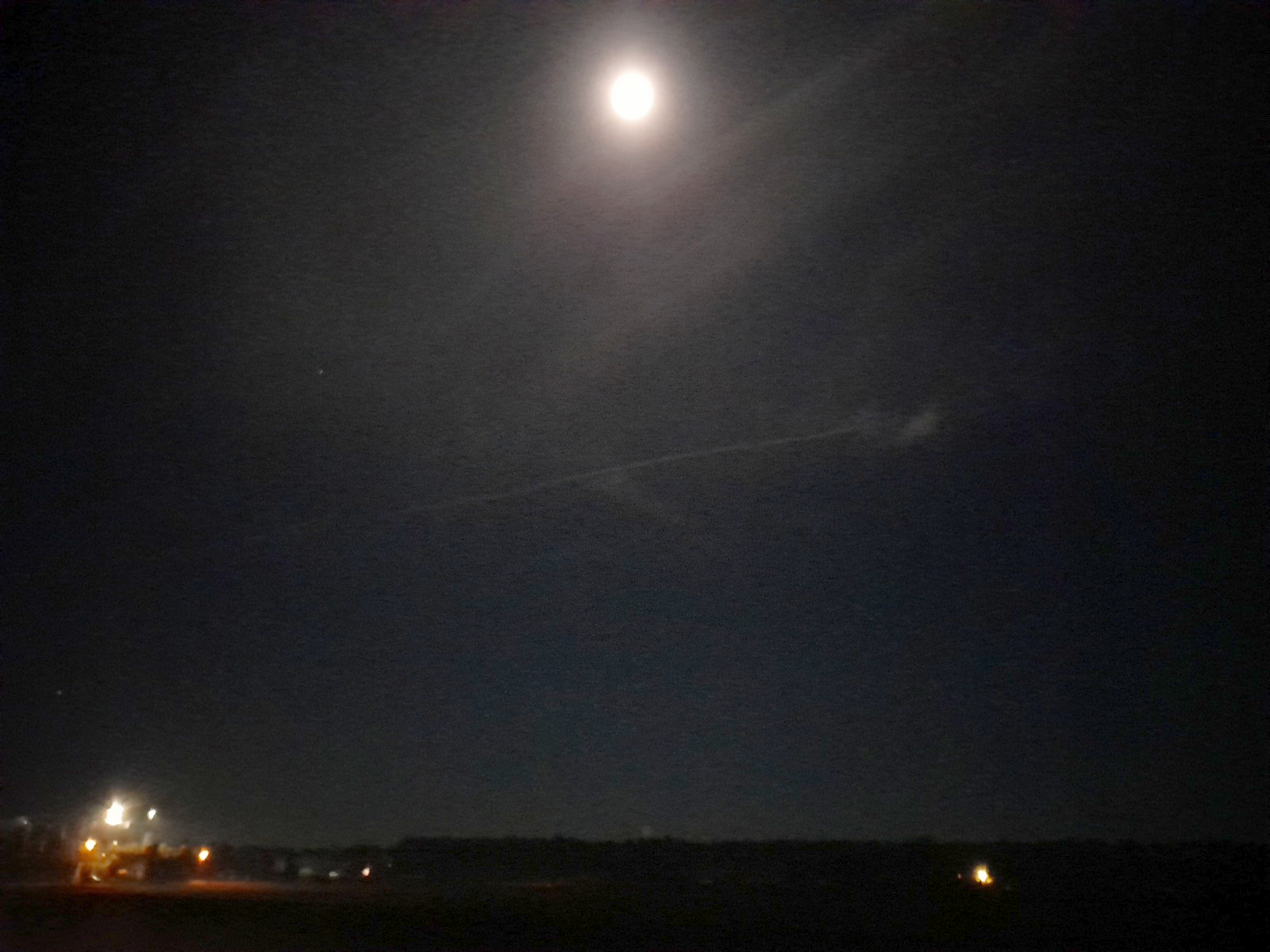 Tego wieczoru efemerydy zapowiadały "duży" tranzyt ISS na tle Superksiężyca w pełni. Księżyc wysoko na południu, średnica 34' (odległość 351,5 tys. km), ISS duża, nieoświetlona. Idealne warunki na rejestrację.