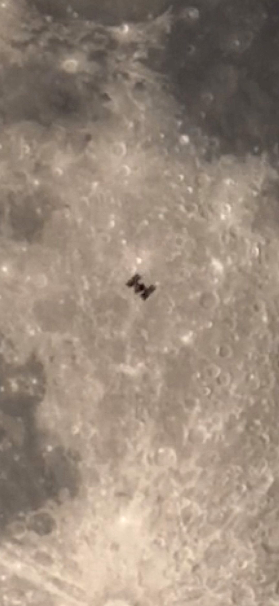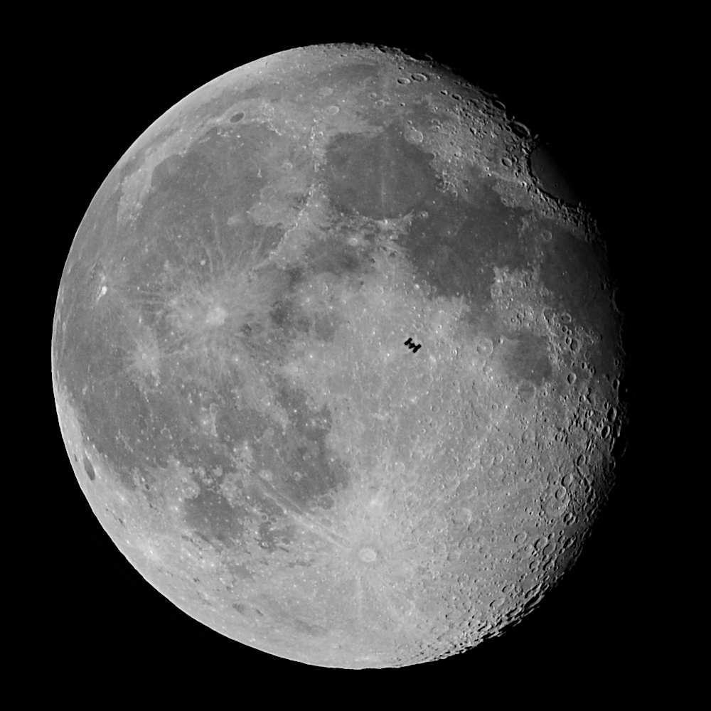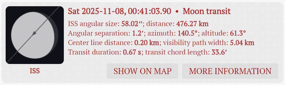 Po tej porażce czułem ogromny niedosyt. Nie zarejestrowałem tranzytu i nawet go nie widziałem. Zrobiłem wszystko, żeby rejestracja tranzytu się udała, a tu taki pech. Co ciekawe, efemeryda tranzytu wciąż pokazywała pierwotny czas, tak jakby nie było opóźnienia. Na pocieszenie wyprodukowałem sobie kolaż z własnego zdjęcia Księżyca z tej sesji z wklejoną "seestarową" ISS. Myślę, że jakby mi się udało złapać tranzyt, to wyglądałoby to lepiej, ale przynajmniej mogę sobie popatrzeć na podróbkę.