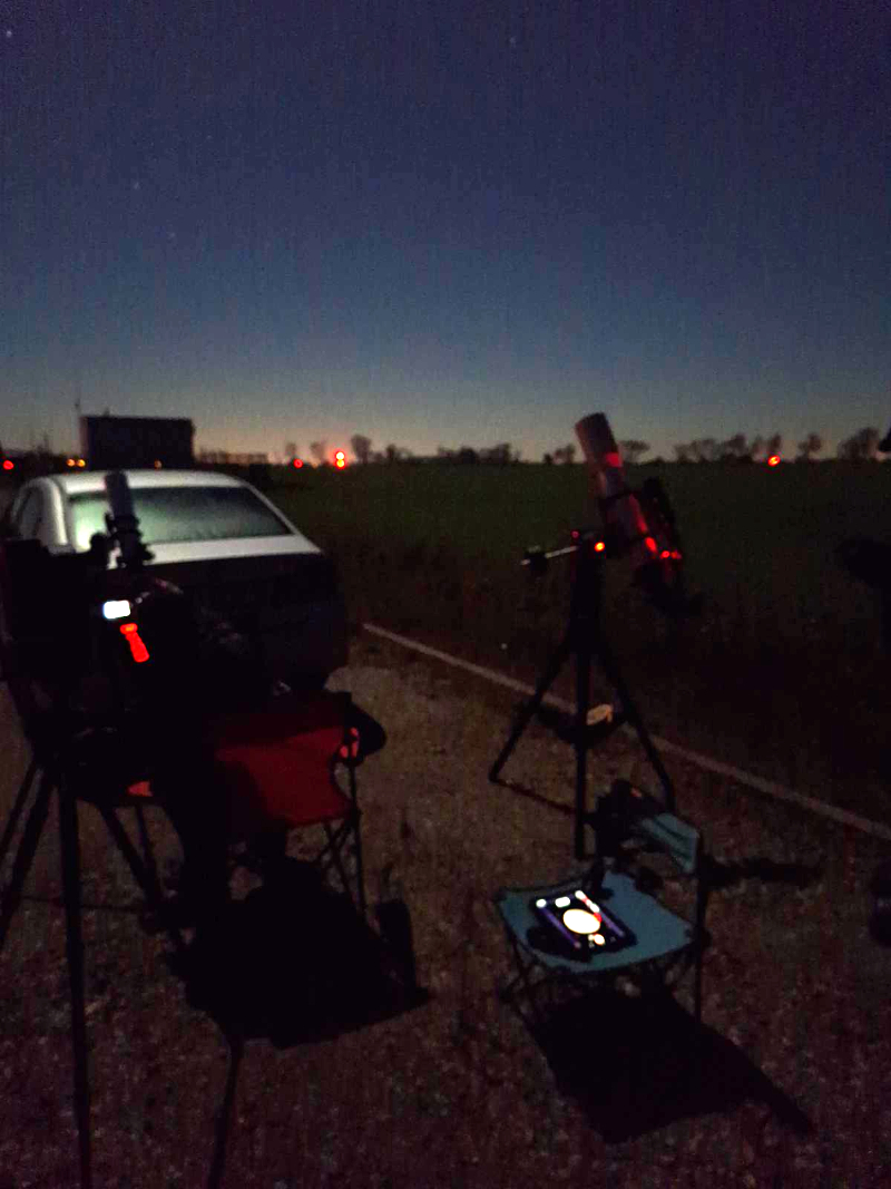 Rozstawiliśmy sprzęt, pogadaliśmy, warunki były po prostu idealne. Mieliśmy komfortowo dużo czasu na przygotowania, weryfikację efemerydy, ustawienie ostrości i parametrów ekspozycji, Thomas zdążył nawet walnąć M42.