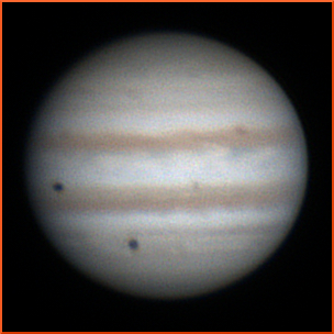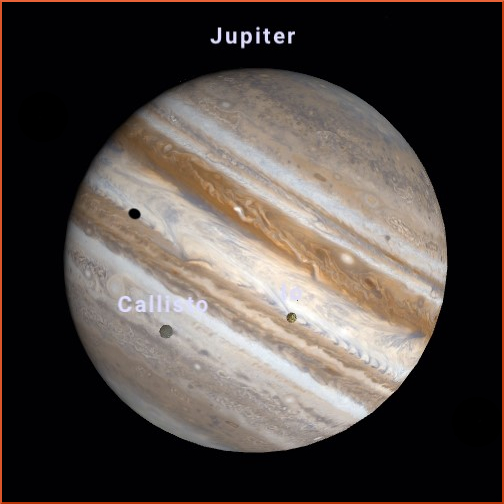 Obserwacje zacząłem, jak oba księżyce były jeszcze "gwiazdkami" bardzo blisko krawędzi tarczy planety. Ostatecznie pierwszy kontakt księżyców z tarczą Jowisza obejrzałem jeszcze przed odebraniem astrostołka. Ten etap wygrał Io - księżyc był widoczny jako wyraźnie niegwiazdowy (tarczka) i przypominał pryszcz odstający od Jowisza. Po przejściu obu księżyców na tarczę planety, scenę przejął Kallisto, widoczny jako wyraźna ciemniejsza kropka na jaśniejszej strefie Jowisza. Io praktycznie zniknął na tle ciemniejszego południowego pasa zwrotnikowego. Po nieco ponad godzinie na tarczę wszedł cień Io, widoczny jako wyraźna czarna kropka sunąca na krawędzi pasa zwrotnikowego. Kilka razy wydawało mi się, że na tarczy Jowisza wyskoczyła kropka samego Io, ale trudno ocenić, czy to był on. Za to na północnym pasie zwrotnikowym była dość wyraźnie widoczna ciemniejsza struktura. Oto zrzuty ze Stellarium kolejnych etapów: