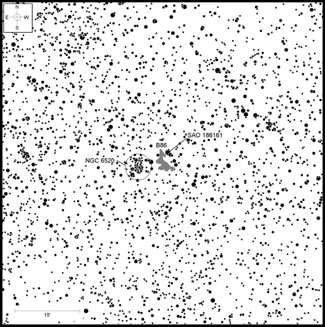 Jeśli chodzi o widoczność, Barnard 86 ma kilka wyraźnych zalet w porównaniu z innymi ciemnymi mgławicami. Po pierwsze, leży pomiędzy gromadą otwartą NGC 6520 a pomarańczową gwiazdą SAO 186161 o jasności 7 magnitudo. Jej położenie pomiędzy tymi dwoma jasnymi obiektami sprawia, że dokładne namierzenie jej pozycji jest dość prostym zadaniem. Kolejną zaletą jest to, że w przeciwieństwie do wielu ciemnych mgławic, które mają dość niewyraźne kontury, B86 ma ostro zarysowane granice. Dokładnie widać, gdzie się zaczyna i gdzie się kończy. Wreszcie, jej klasa 5. w skali gęstości od 1 do 5 wskazuje, że ten obłok jest naprawdę ciemny. Ponieważ Barnard 86 ma tylko 5' średnicy, powiększenie od 100x do, być może, 125x zapewni najlepszy widok na nią i na jej dwie jasne sąsiadki. W teleskopach amatorskich B86 wydaje się mieć kształt klina, którego zachodnia granica skierowana w stronę SAO 186161 jest około dwa razy dłuższa niż strona najbliższa gromadzie. NGC 6520 również rozciąga się na około 5', z jakimiś dwoma tuzinami gwiazd widocznymi przez mój 8-calowy (20 cm) reflektor. Ich bliskie położenie na niebie w sposób naturalny rodzi pytanie, czy Barnard 86 i NGC 6520 są ze sobą fizycznie powiązane, czy też po prostu przypadkowo leżą w tej samej linii widzenia. Dowody astronomiczne sugerują prawdziwe powiązanie przestrzenne. Oba obiekty leżą w kierunku wybrzuszenia galaktycznego, a szacunkowa odległość każdego z nich od Ziemi wynosi około 6000 lat świetlnych, co sprawia, że fizyczne powiązanie jest wiarygodne. Barnard 86 jest prawdopodobnie częścią tego samego kompleksu obłoków molekularnych, z którego powstała NGC 6520. Gromady otwarte, takie jak NGC 6520, powstają z takich gęstych obłoków i prawdopodobnie Barnard 86 stanowi nierozproszoną pozostałość pierwotnej wylęgarni gwiazd. Gwiazdy w NGC 6520 są stosunkowo młode - mają zaledwie kilkaset milionów lat - więc przetrwanie gęstego, ciemnego obłoku w pobliżu jest zgodne z typowymi skalami czasowymi rozpraszania się obłoków molekularnych. Tak więc, Barnard 86 i NGC 6520 nie są jedynie parą optyczną; prawdopodobnie są spokrewnione, dzieląc wspólne pochodzenie w tym samym regionie gwiazdotwórczym. Obecnie, jasne gwiazdy NGC 6520 rozświetlają otaczającą przestrzeń, podczas gdy Barnard 86 pozostaje mrocznym, ponurym rodzeństwem. Wspólnie stanowią wspaniałe studium kontrastu. Nawiasem mówiąc, tych, którzy pod koniec tego miesiąca wybierają się do Stellafane w Springfield w stanie Vermont, informuję, że zarówno B86, jak i NGC 6520 znajdują się na mojej liście Binocular Observing Olympics (BOO) 2025. Mam nadzieję, że spróbujecie dostrzec wszystkie 20 obiektów z tegorocznej listy i zdobędziecie specjalną odznakę za to osiągnięcie. Pełną listę BOO oraz wiele innych informacji na temat zlotu można znaleźć i pobrać ze strony internetowej Stellafane.