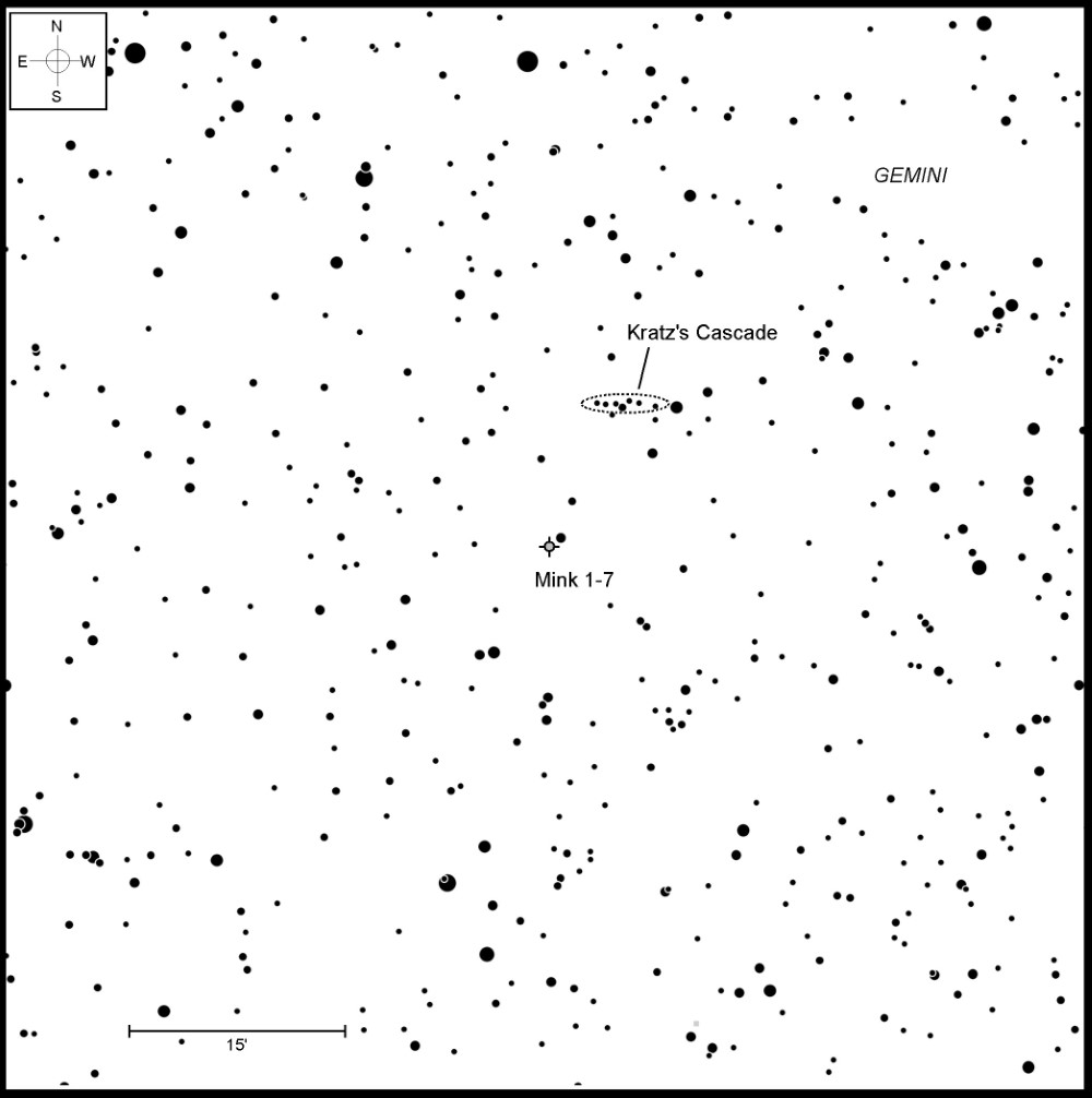 Mink 1-7 leży wzdłuż nogi brata bliźniaka Kastora, w jednej trzeciej odległości od Epsilon Geminorum do Mu Geminorum. Wyceluj około 1,5° na południowy zachód od Epsilon, by dostrzec trójkąt rozwarty złożony z trzech gwiazd o jasności 6 magnitudo, którego wierzchołek skierowany jest na południe. Używając okularu dającego niskie powiększenie przesuń się 25' na południowy zachód od gwiazdy wierzchołka, a dostrzeżesz ciekawą linię 11 słabych gwiazd wijącą się ze wschodu na zachód. Chociaż gwiazdy te nie są ze sobą fizycznie powiązane, tworzą intrygujący mały asteryzm, który z pewnością przyciągnie Twoją uwagę. Nazywam go Kaskadą Kratza, na cześć Dave'a Kratza, weterana obserwacji głębokiego nieba z Poquoson w stanie Wirginia, który jako pierwszy zauważył tę grupkę ponad trzydzieści lat temu podczas obserwacji Mink 1-7.