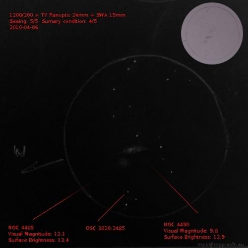 To zaiste piękna parka, bardzo łatwa do odnalezienia przy gwieździe beta CVn. 4485 to była chyba moja pierwsza galaktyczka poniżej 12mag którą zobaczyłem w 8" :) | |