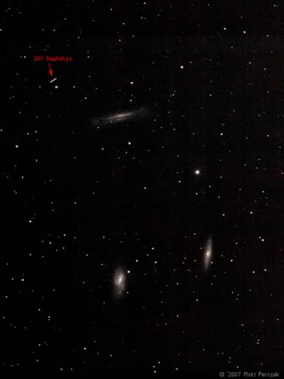 Dodatkowe informacje: Na zdjęciu widać tzw. Tryplet Lwa - trzy sąsiadujące ze sobą galaktyki spiralne. Patrząc od góry to: NGC3628, M65 i M66. Można je znaleźć w gwiazdozbiorze Lwa. Oddalone są od nas o jakieś 35 mln lat świetlnych. Oprócz tych obiektów na zdjęciu znalazła sie też, przelatująca "w pobliżu" tego wieczora planetoida 287 Nephthys. Jest to obiekt z głównego pasa planetoid, który znajduje się między orbitami Marsa i Jowisza. Okrąża ona Słońce w odległości 2,35 AU raz na 3,61 lat. Planetka ma zaledwie 67,6 km średnicy. Znana jest już od 1889 roku. Jej nazwa pochodzi od egipskiej bogini. |